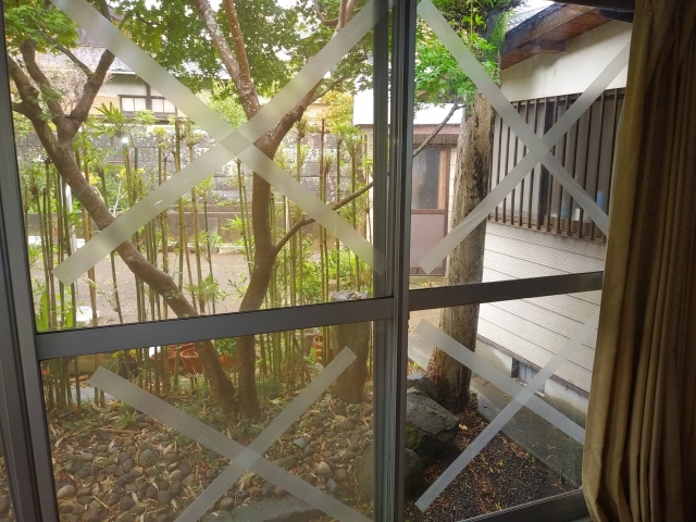 ガムテープで窓ガラスを「×」状に貼っておくと、万一割れたときの飛散を軽減できますが、最近の家はペアガラスや強化ガラスということがほとんどです。
