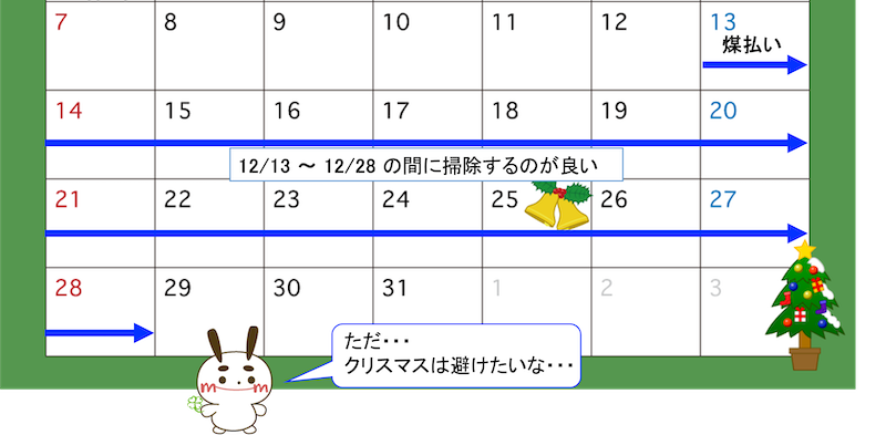 そのため一般家庭でも、12/13 〜 12/28 の間に掃除するのが良いとされています。
