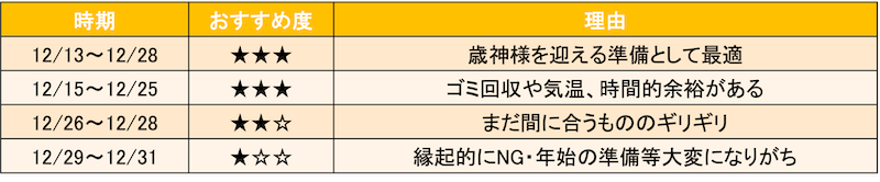 実際、全ての場所を大晦日にやろうとすると、ゴミ回収も終わっていて片付けが中途半端になりがちです。